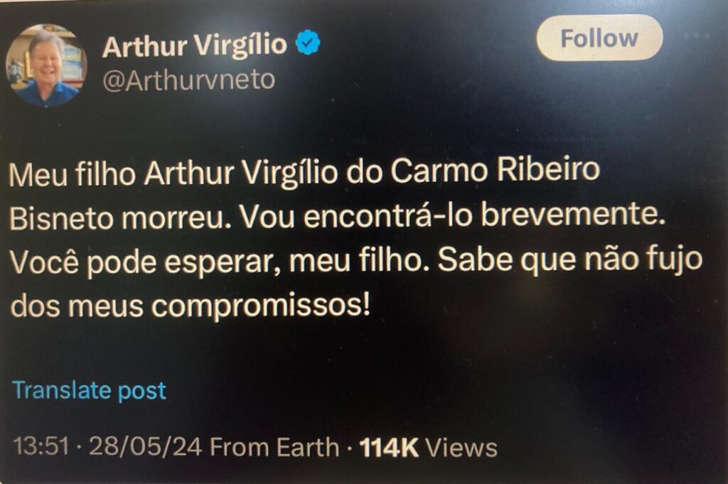 Por meio das redes sociais, Arthur Neto, lamentou a morte do filho.